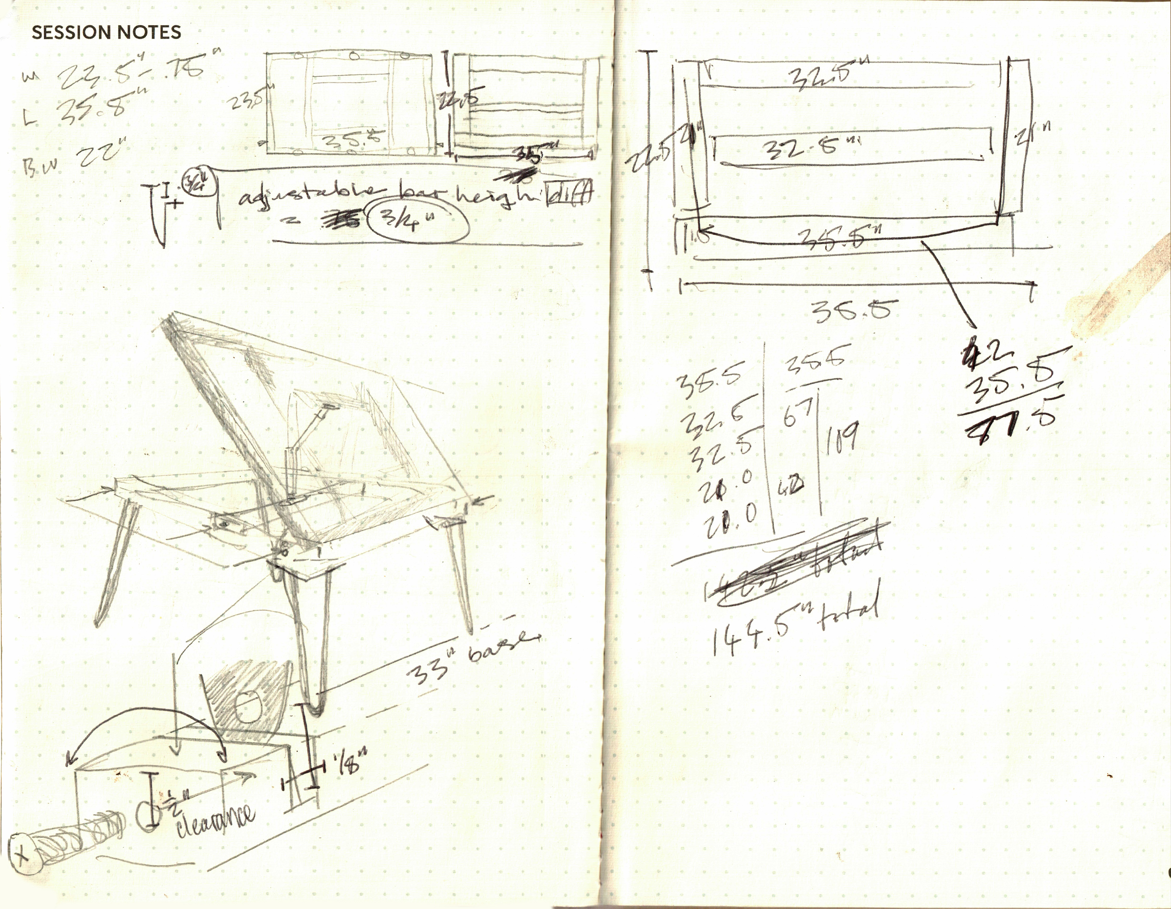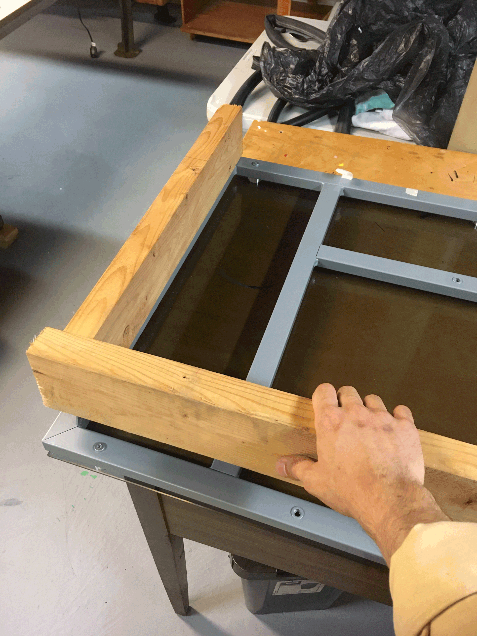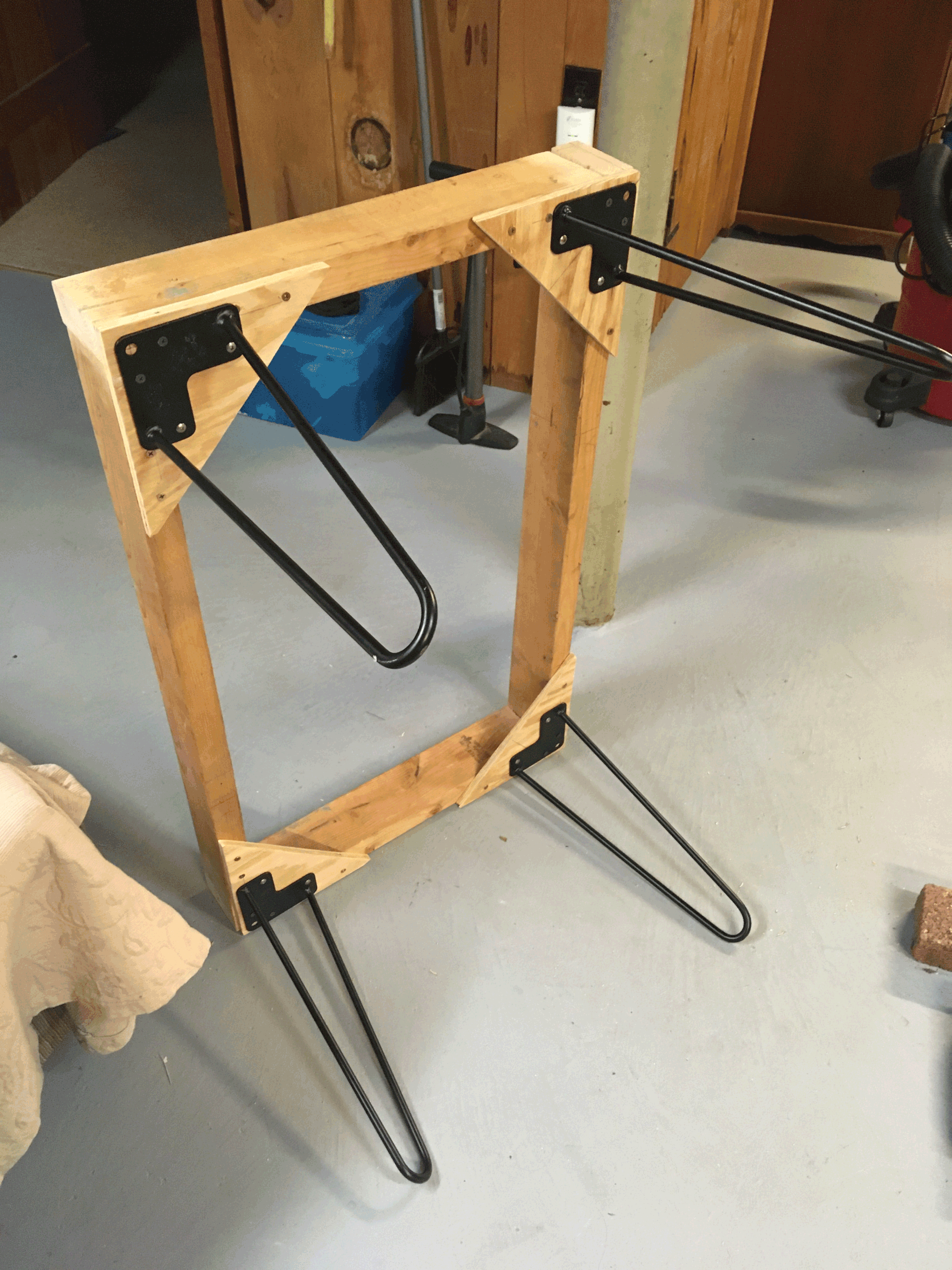 The gist here is that I'm using the table top and adjustable support arm from the drafting desk, and the hairpin legs from my coffee table. The only thing I had to build was a frame in the middle. I needed there to be slots at the front for the hinge of the table with pins, a crossbar for the support arm to anchor in, and corner supports on the underside for the legs to anchor in. The corner supports also doubled as little storage pockets for tools, which I could view through the glass tabletop.
