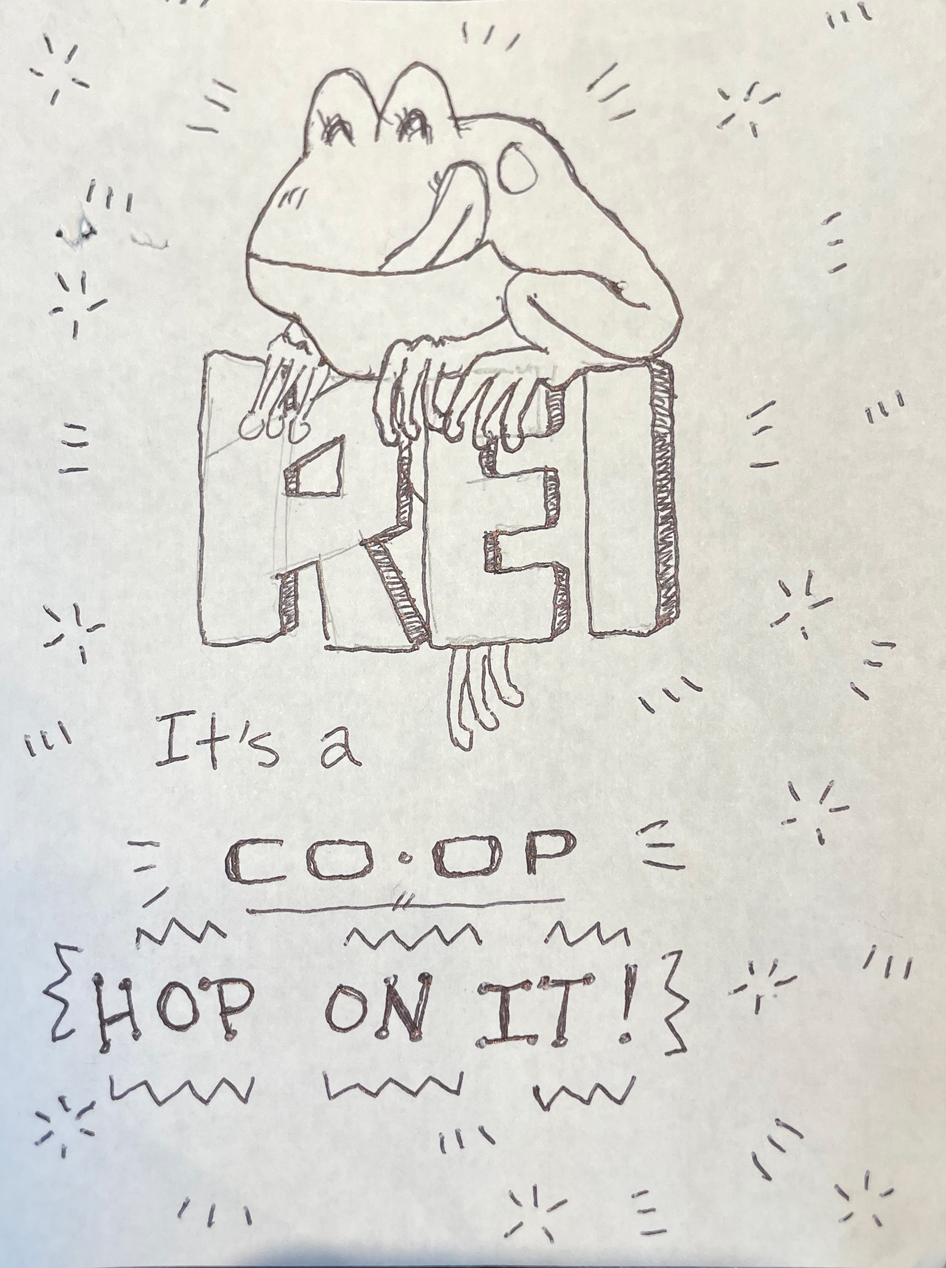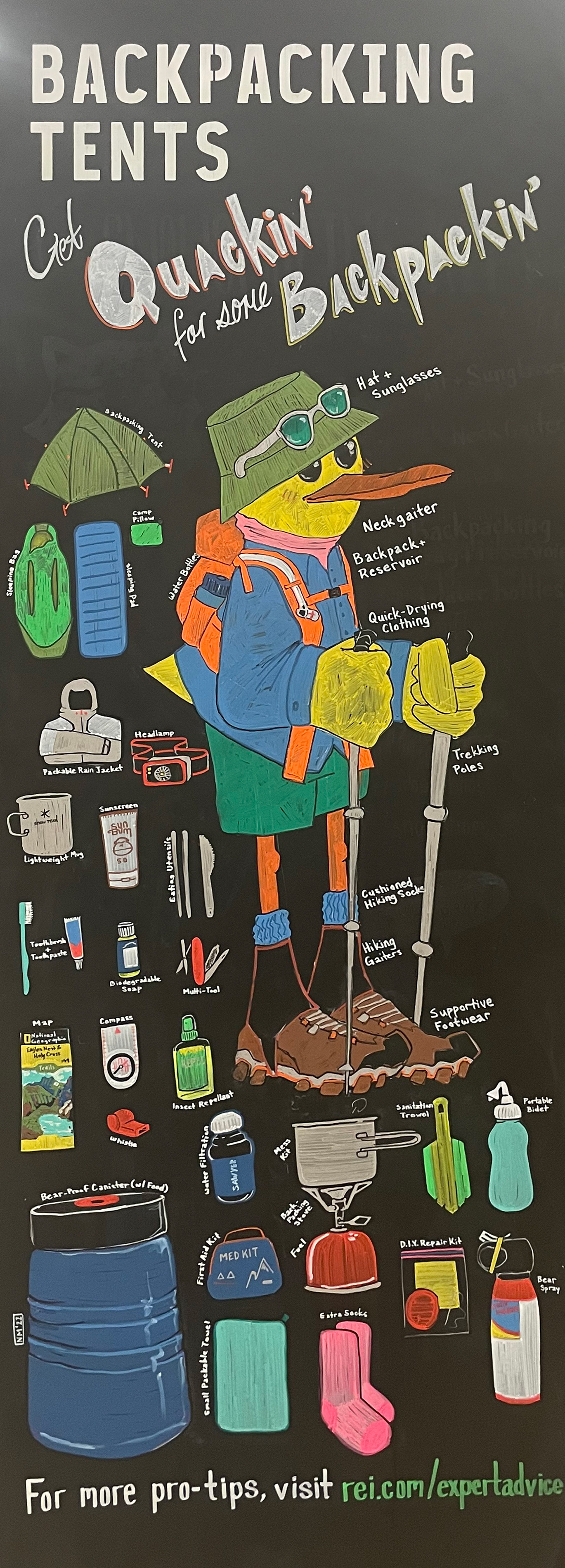 As the self-proclaimed in-house artist at REI in Dillon, CO, I've worked closely with various departments to design eye-catching chalk art to help customers engage with membership, key equipment for our area, and REI's core values of community and sustainability.