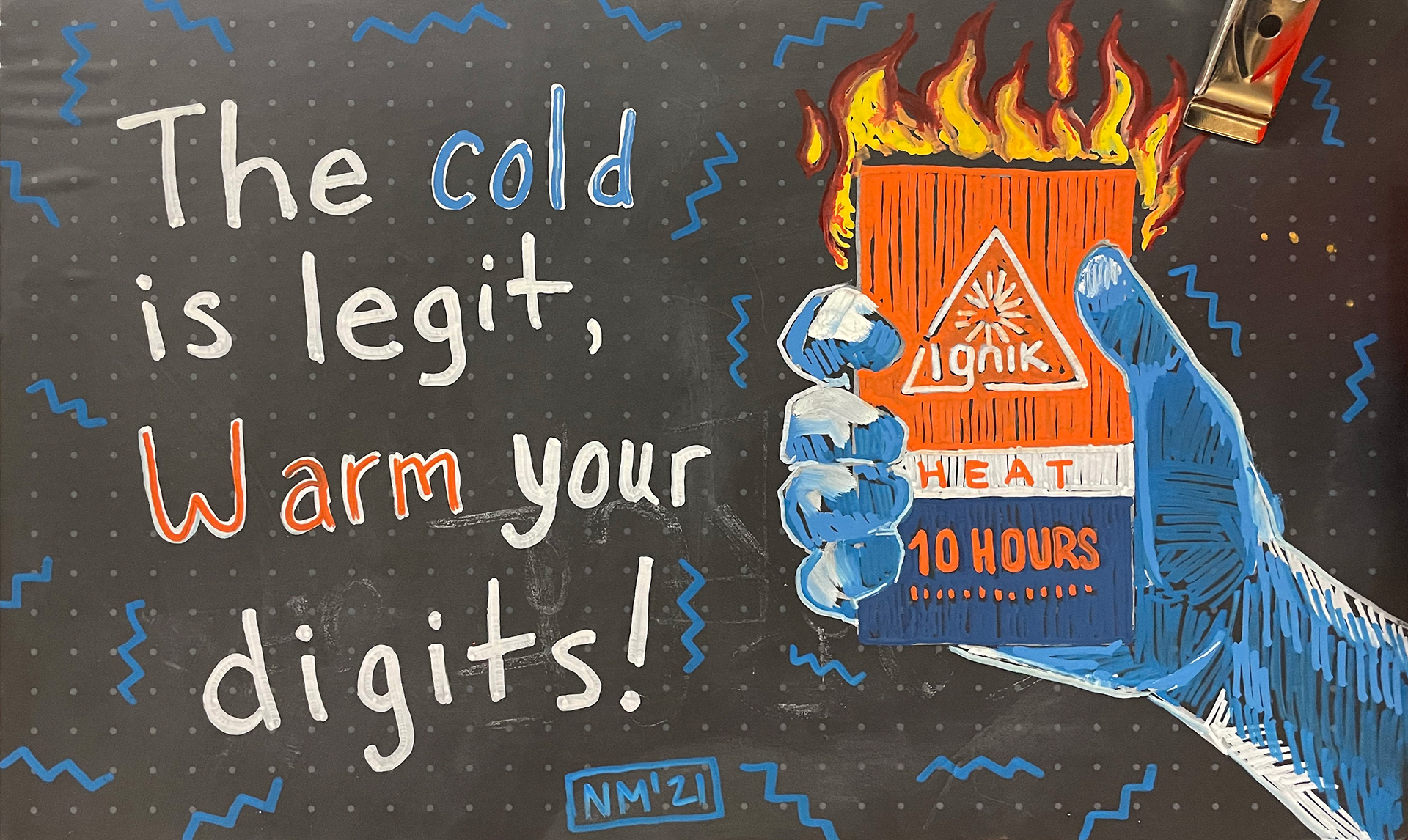 Lastly, my favorite project: It can get terribly cold in Summit county. With the volume of skiers, mountaineers, and backcountry customers, we needed a sign and a designated spot to direct them to. This sign was my favorite because of the marks that I used to create the hot/cold effect. (I was also vey proud of this jingle.)